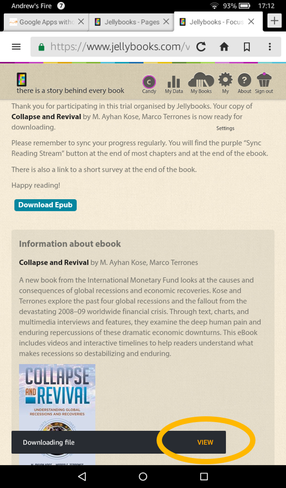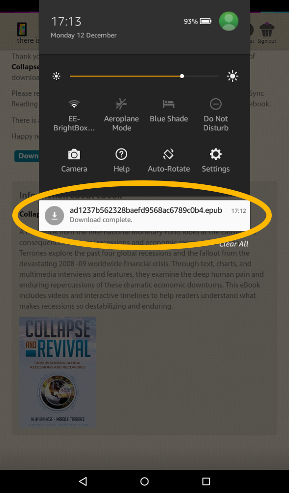 Or, if you missed it and the download has already completed, swipe screen from the top downwards, to reveal the notification menu, where you will see the ebook at the top of the list.